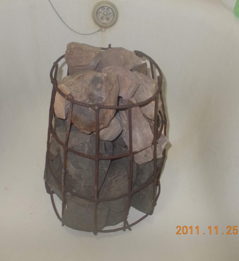 Камни для начала были собраны там же, бело-красный гранит, но оказалось что они трескаются от сильного нагрева и были заменяны на покупные специально для бань.