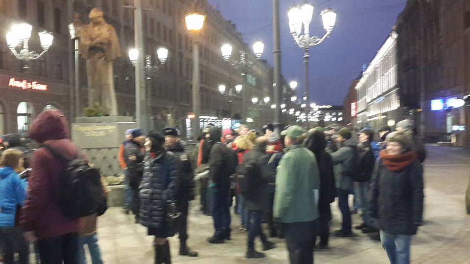 "Надежда в Санкт-Петербурге. Её портреты сегодня вечером по всему Невскому.И держат их достойные люди. Несмотря плохую погоду в виде холода, ветера и полиции, мешающей больше холода и ветра. Десятки автозаков, сотни полицейских, куча эшников в штатском. И новая тактика - они большими группами становятся внутри митинга, постоянно перемещаются, заставляют людей нервничать. Но во всём свои плюсы - благодаря этим "товарищам" и без того достаточно массовое мероприятие, со стороны выглядит очень масштабной акцией. У меня там, на Невском, сегодня спросили - а зачем вы всё это делаете, ничего же не исправите? Во первых, мы надеемся, что сможем исправить. А во вторых - бывают моменты когда, даже в абсолютно безнадёжной ситуации, сидеть сложа руки - подлость", - прокомментировал он.