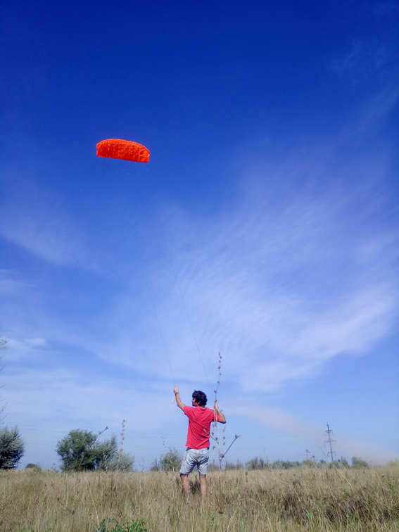 Доброго времени суток. Наконец то настал момент запуска моего первого парафойла(совпал и выходной и ветренный денек). Сначала никак не мог поднять его. Чуть поднимался и сразу плюхался на заднюю кромку. Пришлось отпустить ряд D полностью(видимо нижние стропы её нужно удлиннить) и он без проблем взлетел при ветре 5-6 м\с. Тянул с такой силой что я просто катился по траве в красовках. В зенит уходит без проблем. Ощущения просто супер.