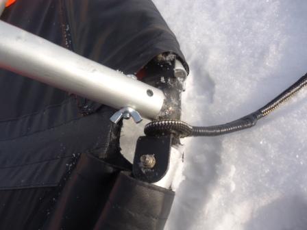 Кстати, гик в задней части изогнут не от нагрузки. Просто подобрана такой формы палка. В магазинах садового инвентаря такие не редкость. На стойки и перекладину надеты дешевые серые пористые теплоизоляционные трубки для сантехники, больше для красоты, чем для функциональности.