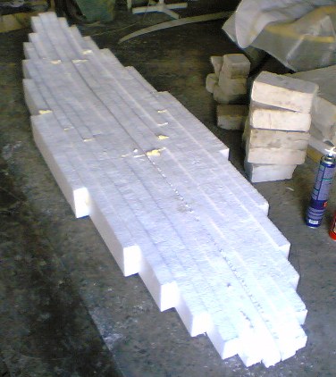 ...естественно ,может возникнуть вопрос:"... почему бы не сделать ядро из цельного куска пенопласта?". Дело в том ,что не так легко найти в продаже кусок пенопласта под три метра длинной,с метр шириной и толщиной сантиметров тридцать.Потом,отходов с него будет очень много,ну и цена естесственно.Также ,продольные линии склейки очень помогут при обработке верхней части доски,являясь ориентиром,т.е. легче добиться симметрии.