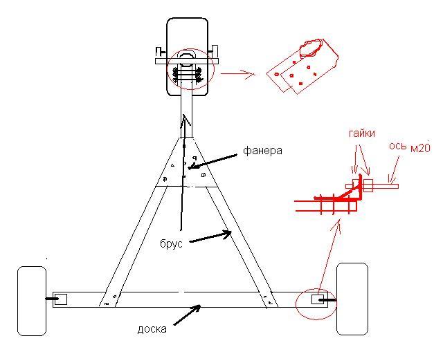 ну а если из дерева вот чертежик набросал.вилку переднюю все ревно из метала придется мутить.можно расширять велосипедную и использовать весь узел с подшипниками.и сиденье сразу со спинкой мутить надо иначе пресс очень быстро устает.