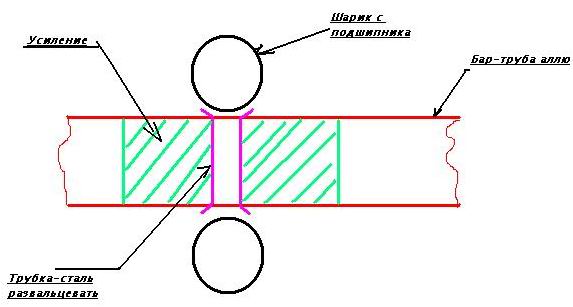... дык рожки то,этож от велосипедных тормозов.Это кронштейны которые на руле стоят,а к ним рычажки прикручиваются(которые руками нажимаем). До дырки в центре дело еще не дошло,но будет так: внутрь трубки вклею кусок дюралюменевого стержня,потом просверлю насквозь отверстие,сделаю с двух сторон конусность и отполирую.