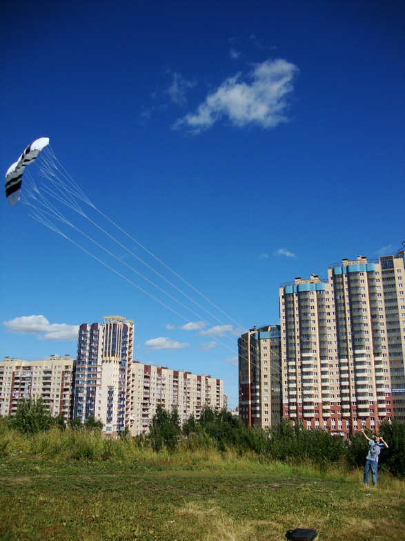 | Fahrenheit писал(а) Втр, 10 Август 2010 22:27 | Дошил я свой кайтик. Пока ходил запускать без строповки. Поставил три стропы спереди и две управляющие на край D.