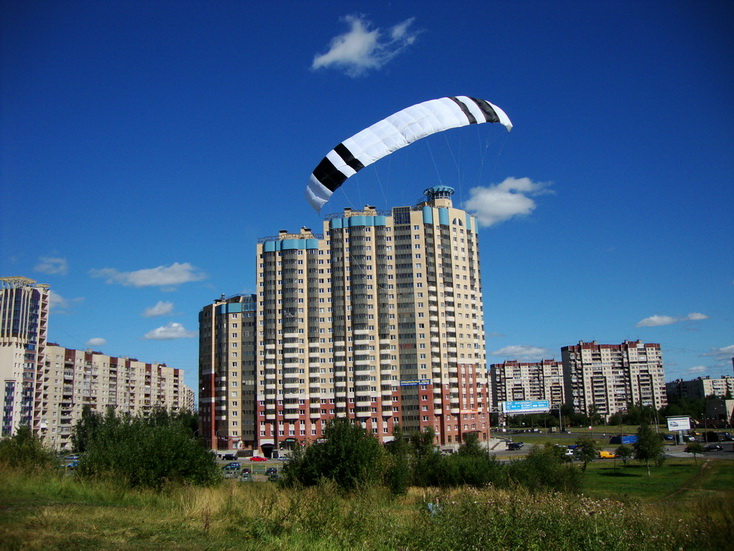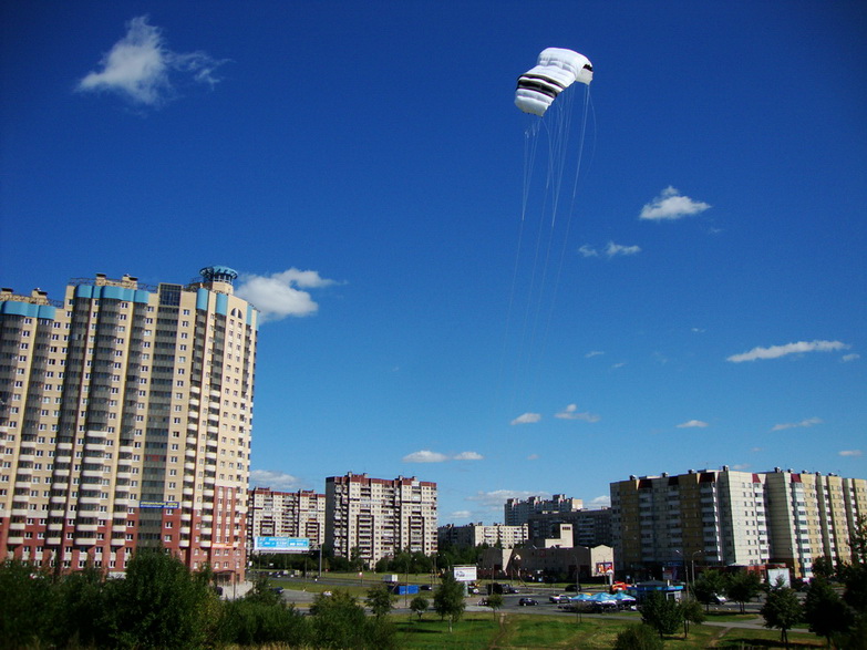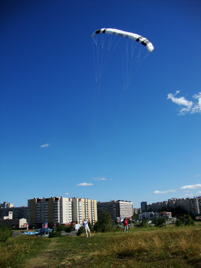 Главное что очень очень вяло реагирует на планку, причем только на повороты. Тягу меняет хорошо, кажется. Ветер правда был слабый, но силовыми стропами (перекосом купола) рулился очень даже замечательно. В зените рулится более или менее (в смысле удержать можно), но если разогнать по диагонали вниз, то вытягивается из падения только силовыми стропами.