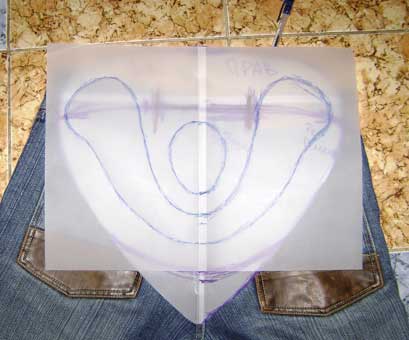 Так вот выкройки. Определившись моделью трапеции ребром встал вопрос как ее раскроить, да так что бы по размеру. Для этого решил раскраивать по своим джинсам. Взял кальку (у меня была форматом А4, поэтому пришлось склеить несколько листов вместе) приложил ее к разложенным на полу джинсам и нарисовал деталь спины, а точнее ее половину.