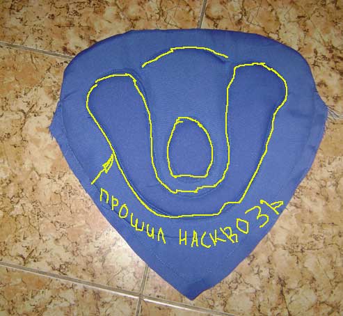 Чтобы ткань на внутренней стороне не борилась прошил насквозь все детали по контурам аппликации. (Эх и намучился я с этой операцией, еле-еле прошил, сломал пол десятка иголок, но все же прошил)