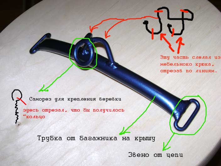 А для изготовления (я уже писал) использовал все что попалось под руку. Трубку взял от старого багажника, тот что на крышу к Жигулям прикручивается, сгибал трубку через колено, наиболее ровный кусок вырезал. Крайние кольца –звенья от цепи подходящего диаметра. А вот сам крючок сварен из трех деталей (центральное кольцо – это саморез для крепления бельевых веревок, две остальных детальки – мебельный крючок, на сколько я понял кухонный вариант. Чтобы было проще сваривать этот крючок в трубке просверлил две дырки подходящего диаметра, вставил дуда детали крюка, а потом все проварил. Все детали из оцинковочного черного метала.