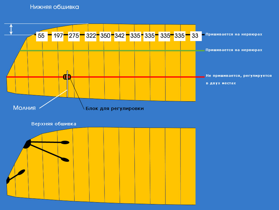 ...ну,раньше я как арки шил,вначали сшивал панели,получал верхнюю обшивку,и нижнюю,устанавливал там всякие ленты,усиления и т.д. Потом шил на одну обшивку нервюры.Потом сшивал по передней кромке две обшивки и "замыкал " их через нервюры. А в этом проекте хотел в момент соединения панелей,сразу крепить нервюры и ленты,потом соединить по передней кромке и опять на другой обшивке скреплять панели с "замыканием" на нервюрах. Тем самым почти в два раза уменьшается число швов (и дырок соответственно). Но оказалось что такой способ довольно трудоемкий,особенно на этапах "замыкания " обшивок. Поэтому решил делать по своему старому способу. Да и потом,при виде почти трех десятков квадратных метров кусков ткани вокруг машинки,даже опытная швея с непривычки может впасть в истерику....