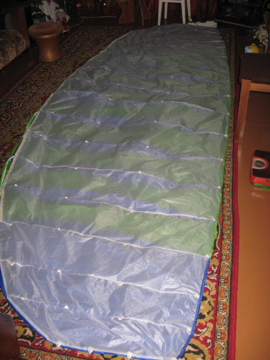 Принимайте в ряды самодельщиков. Тоже сшил мегафойл. Делал из кусочков гельвенора, еще давно заполучил обрези от парапланерного производства. Нервюры усиливал диагональными прошивками. Для строп использовал старые стропы от параплана, которые не держат номинал для параплана, но для кайта вполне неплохо. Петельки сшить не удалось, вязал узелочки. Пока фото нет, сделаю, обязательно выложу, получился очень пестрый и полосатый, т.к. из разноцветных кусочков.