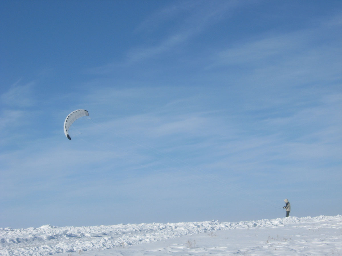 фотоаппарат наконец то сдох, начали собираться домой как вдруг ветер усилился... решил потестить ветер =), пару раз прокатившись от порывов по снегу на ногах и известном месте по 6-7м понял что с такими стропами тут делать нечего...тянулись как резинки, тяга была зверская, кайт превращался в парус и становился совсем неуправляемым. Короче не стал испытывать судьбу. В общем день удался!