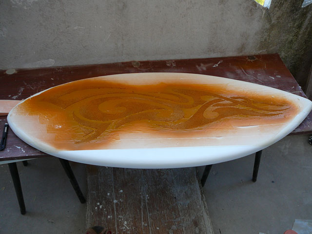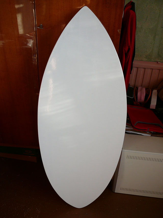 А косательно соли сам не ожидал что в смолу впитается, смола сильно жидкая оказалась и соль в ней просто утонула, я в первый раз солил и наверное последний. Кстати соль уже зачистил шкуркой и буду перекрашивать, пробовал на скиме катать, понравилось то что держит курс хорошо - острые канты сделали свое дело, еще на нем хорошо волны брать он длинее других скимов, но скорость большая нужна из за того что он тонкий легко погружается в воду и на волне может зарыться.