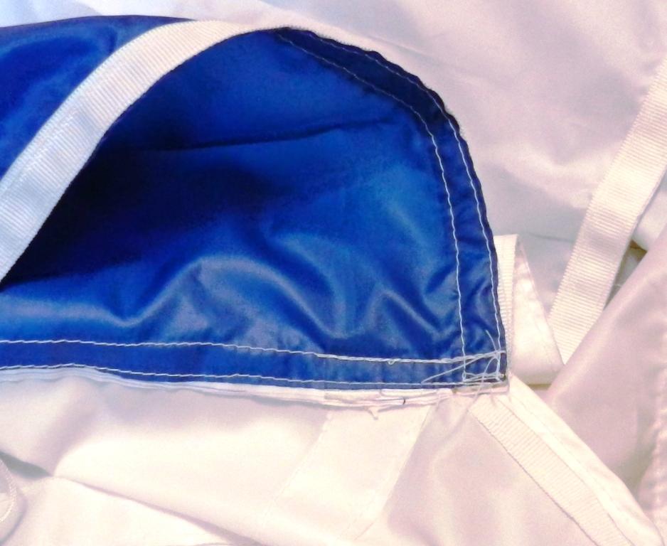Берём верхний и нижний скин одной секции, накладываем их друг на друга лицевой стороной и прошиваем по передней кромке. Далее всё то же самое проделываем с остальными закрытыми секциями. Затем стыкуем первую секцию со второй(можно зафиксировать иголками), приклыдываем нервюру и начинаем все получившиеся три куска ткани сшивать. Не забываем про петельки для строп. Далее собираем низ. Сшиваем нижние панели друг с другом пристрачивая к ним нервюры и вставляя петельки. Лепим это к одному уху. Далее начинаем закрывать верхом. Накладываем лицевой стороной друг на друга две верхние панели, фиксируем иголками(прищепками)и пришиваем это к нервюре. И так до конца.