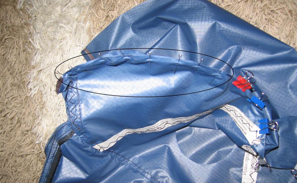 В итоге прошил как получилось... но на верхнем полотне в передней части (красные черточки на рисунке, где закругление, самый геморный момент) появилось несколько мелких складок, распорол, перешил, складки получились чуть в другом месте.. в итоге забил, дырявить по шву больше не решился, но думаю в этом месте косяк будет влиять "на полет".