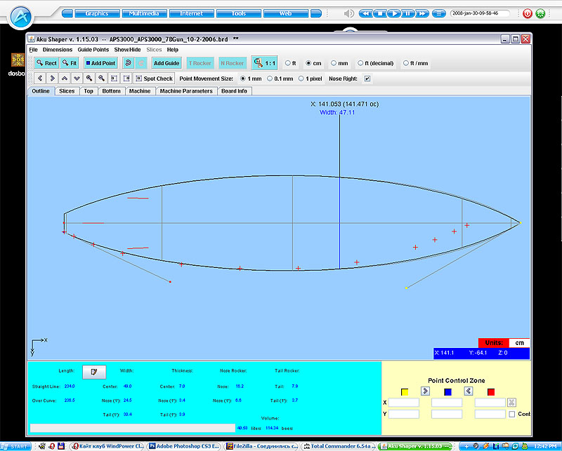Хочу заметить такую вещь, максимально приближенная ширина доски к корме хороша для слабых погодных условий, при нормальном ветре эта ширина мешает, она оказывает большое сопративление при движении поэтому все профи доски очень узкие, для лучшей устойчивости на курсе на корме делают еще конкейв небольшой, реданы, также как и на серфе ставят несколько плавников, дело в том что при очень большой скорости и узкой корме тем более на волнах воздух с поверхности в большом обьеме попадает под днище доски плавник на корме все больше оказывается в воздухе, для этого его увеличивают но при увеличении мы опять получаем потерю скорости и тут выход из положения поставить два или даже 4 плавника не большой площяди, к тому же эти плавники делаются по профилю асиметрично и распологаются друг к другу под углом что позволяет маневрировать на доске как на маунте.