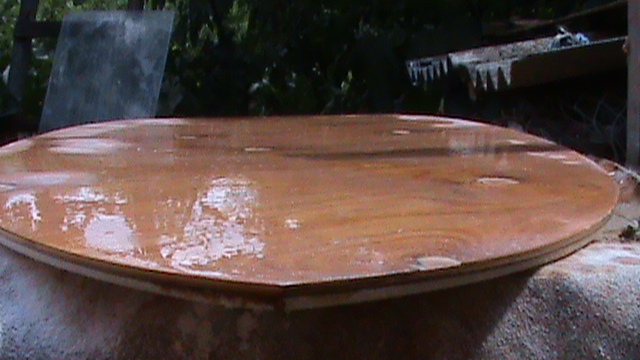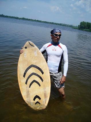 Начал мастерить скимборд. Вырезал заготовку из фанеры (цельную, не из двух частей). Сверху обклеил стекловолокном (ткани не было, только вчера привезли из Краснодара). Сегодня рассматривал фоты кайтбордов и обнаружил, что некоторые модели (а может и все?) имеют снизу плоский профиль, а сверху закругление. Никогда просто кайтборда, и тем более скимборда близко не видел.