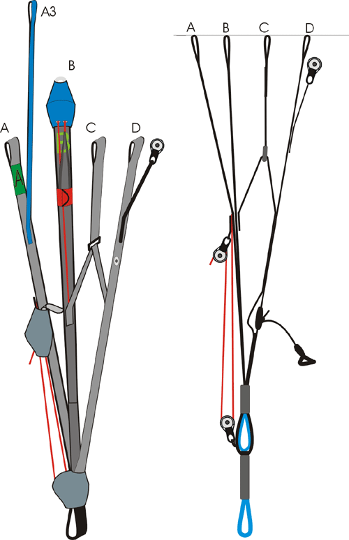 На сколько помнится должно всего быть по 2-конца с каждой стороны,хотя производитель может сделать по парапланерной аналогии.