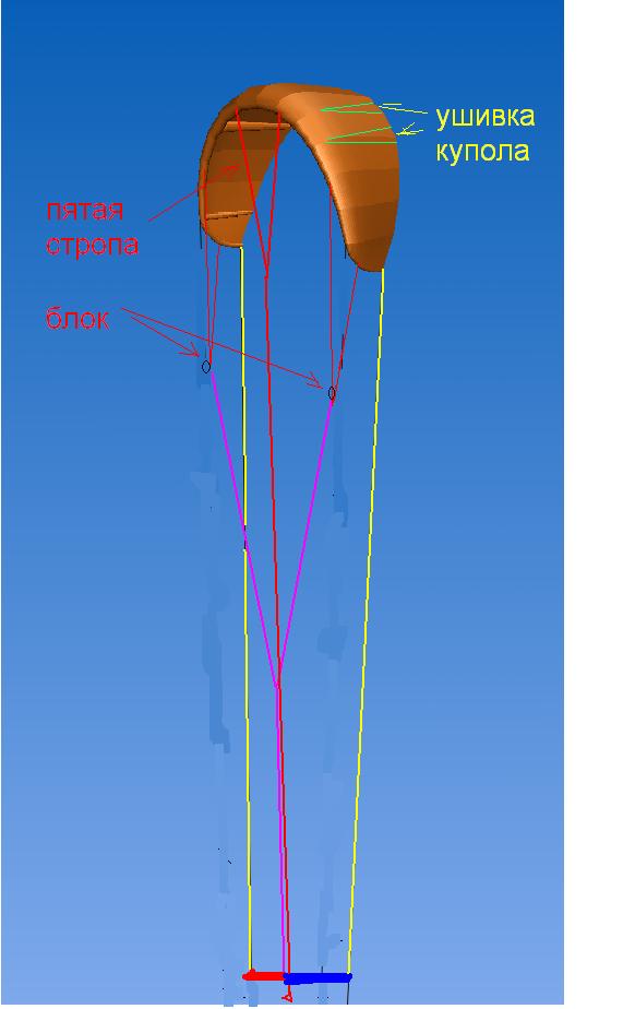 идея в том чтобы купол при отпускании управляющих перестраивался по углу атаки.тоесть уменьшался .для этого силовые буду цеплять к куполу через блок -типа Y.для этого на куполе шьем усиления из ленты так чтобы старая точка подцепа находилась между ними .если смотреть сбоку.и для пятой стропы аналогично шьем конекторы у центра ,я буду шить две точки.