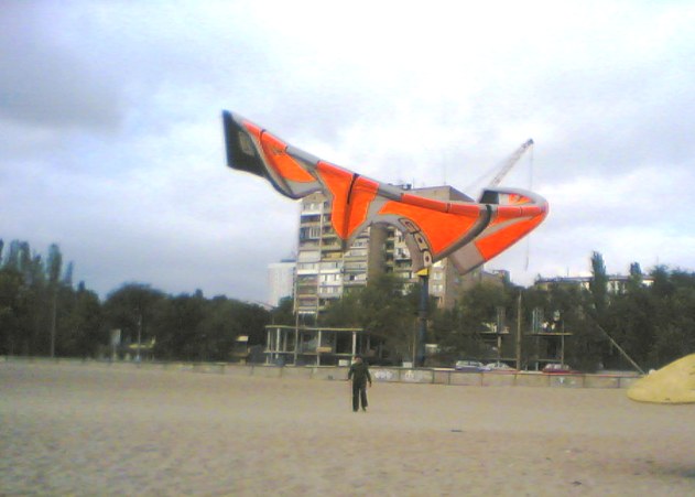 Один из недостатков кайта,обернулся некоторым достоинством.Дело в чем,когда катаюсь на месном водоеме,то меня бесит пляжный песок.Липнет он сабака,к куполу.Нужно ждать,пока высохнет,чтоб струсить перед упаковкой. А тут в сырую погоду. прицепил кайт за пятую стропу,он взлетел вверх рогами (а это его недостаток при рестарте с воды).И висит себе над землей сохнет....