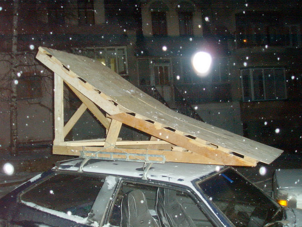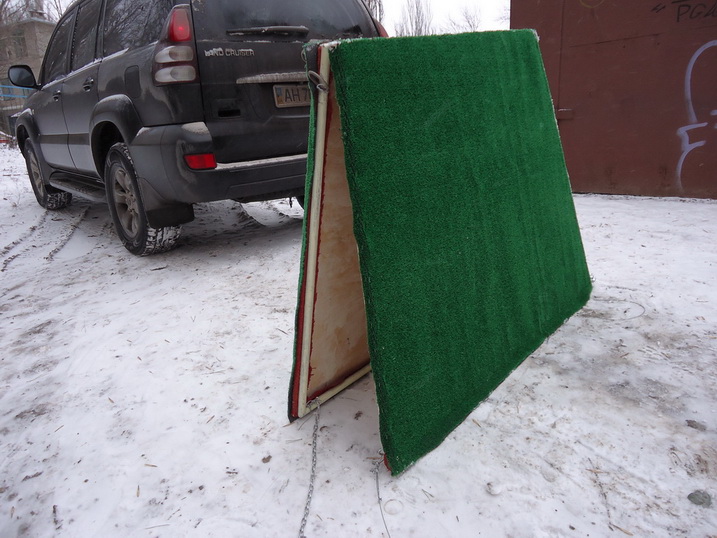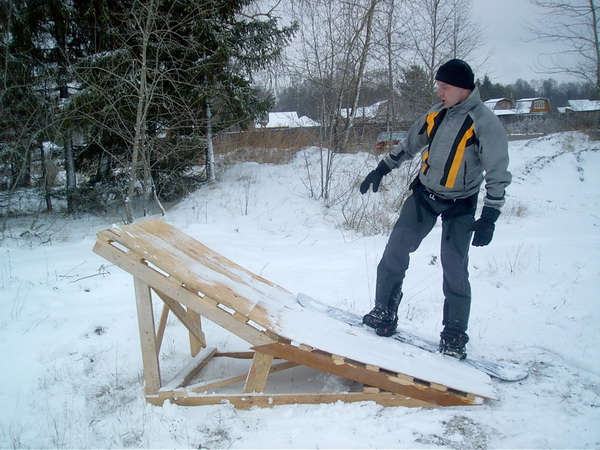 Наконец-то выпало немного снега. Катаясь по полям и рекам надоедает трамваить, поэтому решили с сыном изготовить перевозной трамплин, который бы вмещался в багажник машины.Его размеры в сложенном состоянии 1200х1000мм.Трамплин на земле выглядит как разложенная книга с растяжками внизу. Верхняя часть его обшита 10мм фанерой, облицованной искусственной травой. Кто-нибудь делал подобное? Что можете порекомендовать?