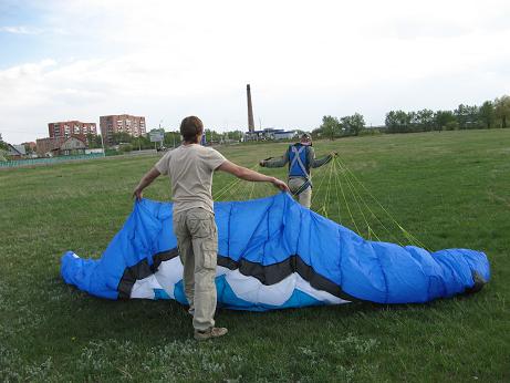С 10 м2 ты вряд ли оторвешься от земли Даже на лыжах это будет бешенная, а соответственно и опасная скорость. Лучше сразу делать 14..16 м2, с такой площадью можно хоть поподлетывать с горки. В любом случае, купол площадью 15 м2 рядом с настоящими парапланами кажется ОЧЕНЬ маленьким, удивительно что на нем вообще можно взлететь с ног.