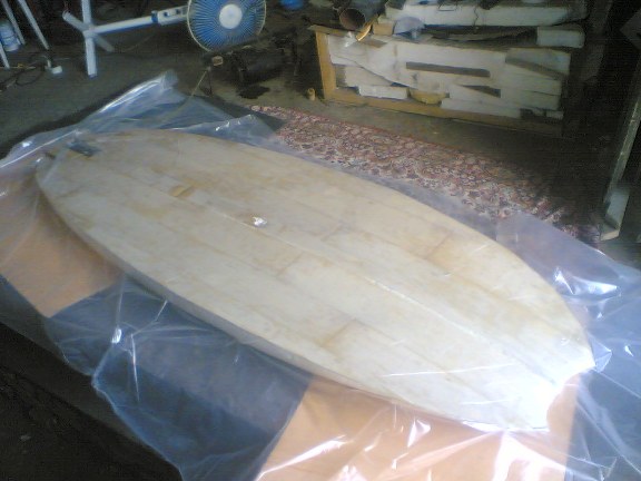 ...окдеивал вначале одну сторону,потом другую.Предварительно полосы шпона нужно подогнать,чтоб по-кривизне укладывался.Оклеивал эпоксидной смолой.Доска предварительно оклеена на ПВА агроволокном.