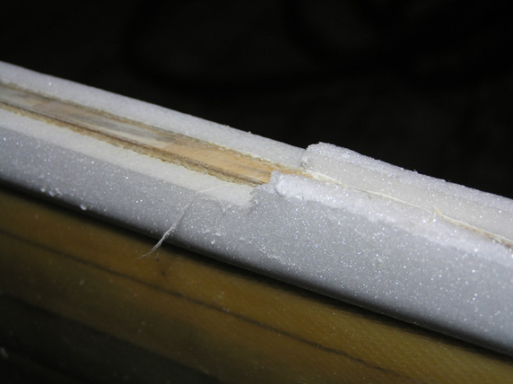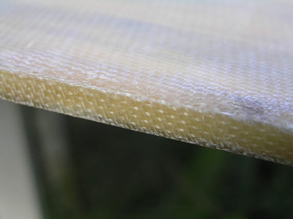 8. Ламинирование. ВНИМАНИЕ,: не берите толстую стеклоткань- слишком тяжелая. Приходится постоянно балансировать между "ткань не пропитывается" и "слишком много смолы- тяжело". Я купил Т-11 (по моим измерениям толщина 0,275)- так вот ИМХО она толстая. Технология пропитки следующая: ложим стекло на стол и выливаем на него смолу и разглаживаем.... переворачиваем о ложим на заготовку.... Берем валик резировый или на него похожий и разглаживаем, убирая пузыри.....Потом выливаем сверху смолу и шпателем резиновым разглаживаем... Получаем гладкую блестящую поверхность... Да, забыл, перед ламинированием сделал укрепительную полосу вдоль по днищу и две полосы крест-накрест по палубе... После чего - тест на прогиб