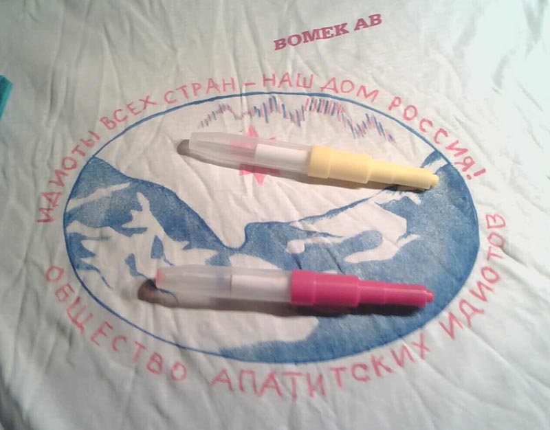 Вот фотки фломастеров на фоне старой много раз стираной футболки, разрисованой этими же фломами.