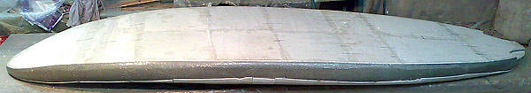 Легкой конструкционной стеклоткани прямого замасливания до 200 г/м не нашел...тяжелой полно но не подходит.Попалась непонятная пропарафиненная тряпка серебристого цвета 180грамм на метр,сетчатого плетения,стыренная еще в 90 годах на судостроительном заводе ЗАЛИВ.Парафин изничтожал в муфельной сушилке при 250-300 градусах,4-5часов.(надо бы дольше,дык гнали взашей).Кинул первый слой,завакуумировал.Сушил печкой под полиэтиленом.Лучше всего подходит тепловентилятор.Зашпатлевал,пошкурил,кинул второй слой.На этом этапе,где уже видна вся КОСМИЧЕСКАЯ МОЩЩЬ будущего МЕГАдевайса необходимо страшным усилием воли взять себя в руки,дабы не побежать на ближайший водоем для гидродинамических испытаний!!! Shocked С твердым пенопластом в стране тоже напряженка.нашёл несколько огрызков,струной распустил на пластины.Кроил по месту.Края палубы гнул феном.Дальше намазал смолой и в вакуум.