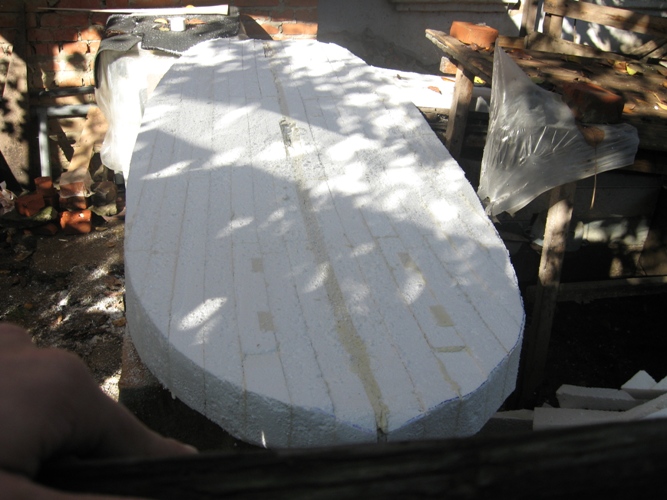 При обработке заметил что на стыках пена немного разъела пенопласт , но это только добавило усиление по всем швам (думаю не намного хуже чем эпоксидка зато легче).Сегодня погода была хорошая, вынес на улицу и с 12.00 до 18.00 выпиливал и шлифовал.Завтра продолжу придание нужной формы и может к вечеру обклею дно х/б с ПВА.index.php/fa/5750/0/