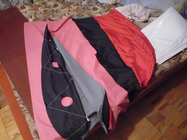 Все привет сегодня наконец-то испытал сшитый мной Megafoi.Вообщем полон впечатлений и эмоций.Шил я его проекту Megafoi и строповка таже что и в проекте. Думал что не полетит но после долгих попыток все таки полетел.Оказалось что силовые стропы были длинее строп управления.Долго не мог понять в чем дело. Ветер дул не сильный порывами где-то 4 м\с в крае ветрового окна он чето летал плохо. Вообщем с управлением я чето плохо разобрался т.к управлял силовыми стропами.Управлял кайтом ручками хотя руками держался за силовые стропы,трапециию пока не сшил. Фоток с запуском нет т.к запускал один, но я выложу некоторые фото как шил и что получилось. Подкупольные стропы шил из рыболовной Дайнемы, сначала расплющивал Дайнему шариковой ручкой потом сшивал,фото как шил есть. Только вот стропы силовые и управления сшил из капроновой веревки чуствуется что кайт тормозит из-за того что стропы сильно тянуться .Ткань на кайте не знаю какая, пришел в магазин и купил самую тонкую не продуваемую балонь.Кайт без строп 1.2 кг весит посчитал где-то кв.м. весит 70 грамм.Вообщем всем много ветра ветра.Если есть вопросы обязательно отвечу.