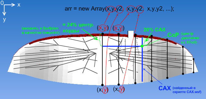Принцип его работы показан на рисунке ниже (это файл из справки к скрипту). Если XFoil выдал, что центр давления (большая зеленая стрелка) находится на 20% хорды профиля, то на самом деле это значит, что он находится на 20% САХ. Сдвинув эту точку до центральной хорды кайта, получаем 24% от центральной хорды. Именно эту цифру, 24%, надо указывать в качестве towpoint в Surfplan'е.
