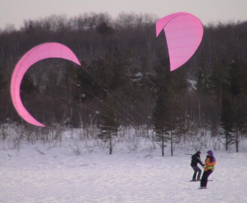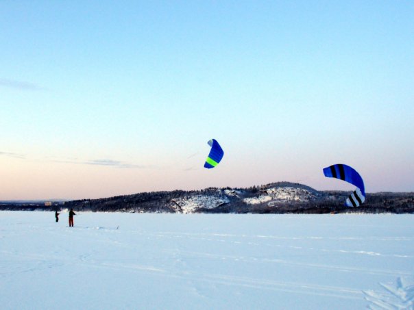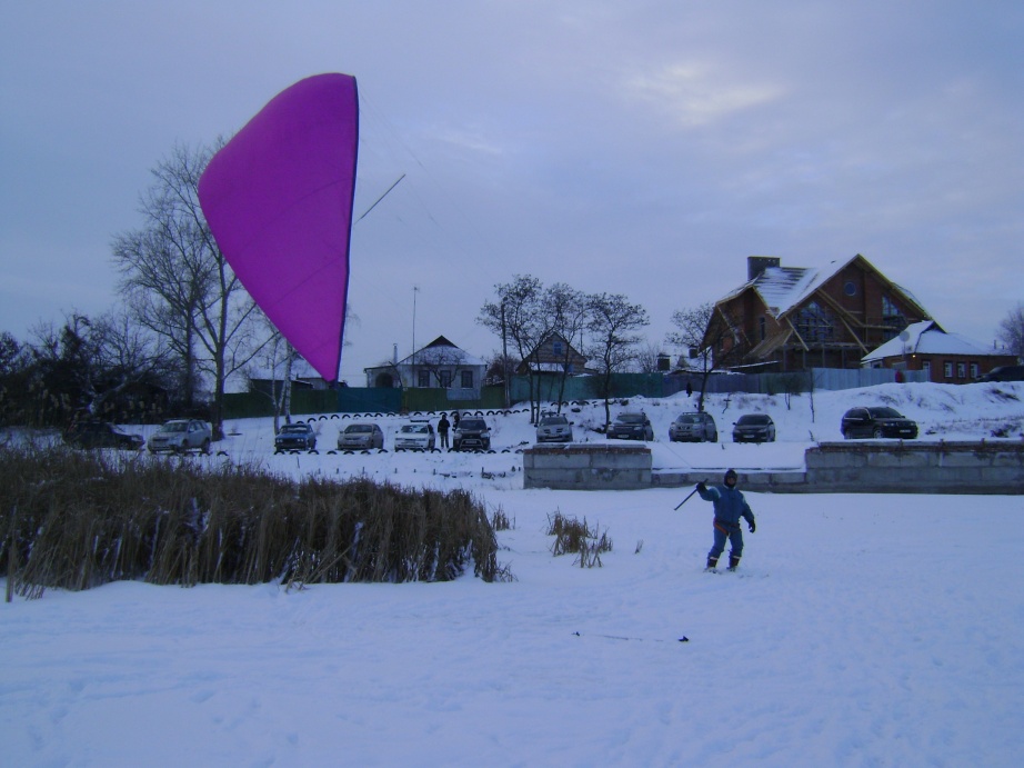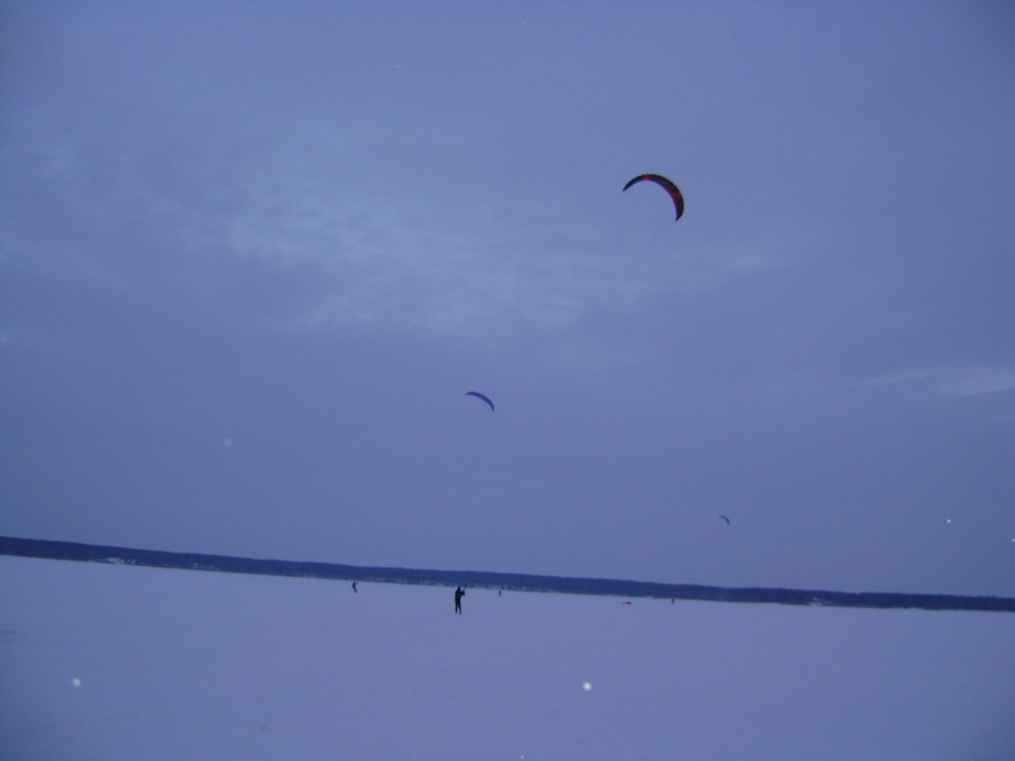 По каталке. Соревнования пришлось отменить из-за слишком разношерстной компании и длинного маршрута, решили переименовать в заезд-каталку. определились с ориентирами и рекомендациями кому куда рекомендуется доезжать и откуда возвращаться, чтбы потом не выискивать на просторах водохранилища. Были сотове телефоны, машина подбора на дороге вдоль воджохранилища и девочка Маша на связи. Двинулись в 11.30. Те, у кого былти кайты 10-15 м/кв пошли довольно уверенно, остальные с переменным учпехом. Ветер, дующий по перек водохранилища на нижнем пределе цеплялся за хвойные леса и временами просто исчезал. Коньковый ход был одним из главных тауктических ходов для разгона кайта и получения хоть какой-то тяги. Мы с Али протяащились так ококло 8км и приняли решение лечь на обратный курс, т.к. вопреки прогнозу ветер стал пропадать на все больший срок, а дальше маршрут шел в лавировку. Позади нас и в стороне то взмывали вверх, то раненой птицей падали на снег фойлы. обратная дорога состояла из двух частей. Вначале та же силовая подготовка лыжника конькового хода, а потом ветерок немного раздулся и подвернул так, что стал дуть вдоль водохранилища, что позволило весьма недурно разгоняться и легко лавироваться против ветра. Интересно было рыбацкие палатки использовать в качестве вешек для слалома. Их там было много сотен, выбирай любую трассу. Остаток дня мы и провели в таких спринтерских 2-3-х километровых каталках заездах. под вечер вернулись те, кто обладал большими площадями и те, чье упорство продвинуло дальше по трассе. Последние вернулись уже хорошо затемно.