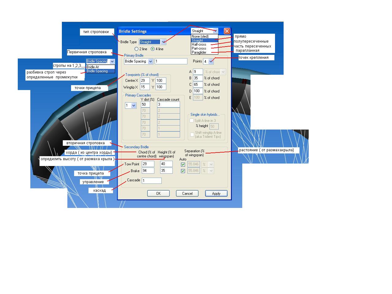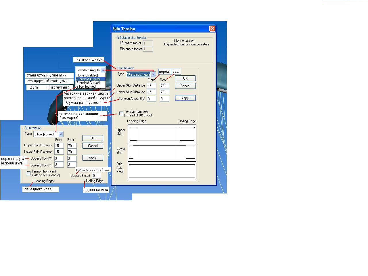 открывал этот файл русик и оставлял на верху экрана как пример, хотя через несколько дней выучил английское меню, там ни чего сложного просто тыкал и размеры разные ставил и смотрел на изменения в крыле и запоминал что и как,начинал со строповки.