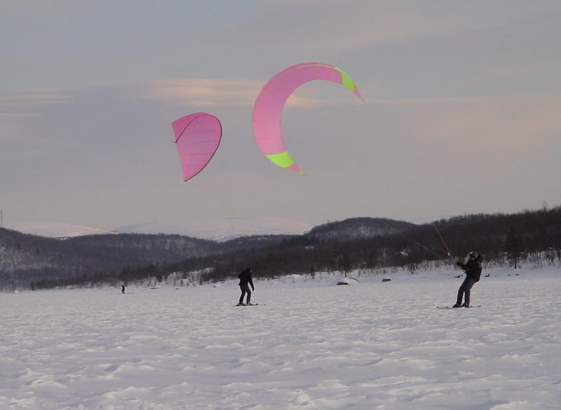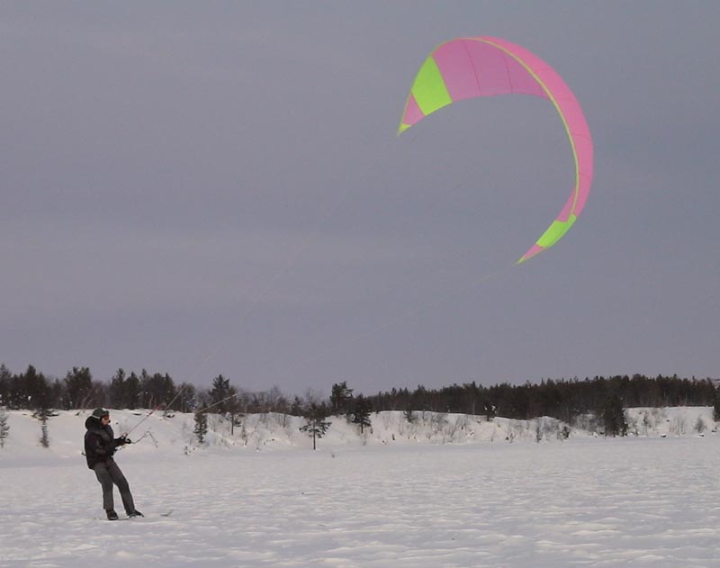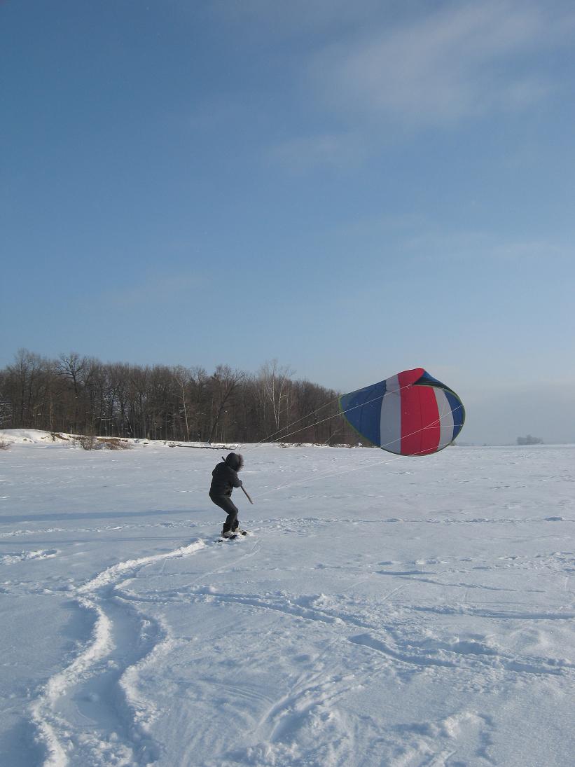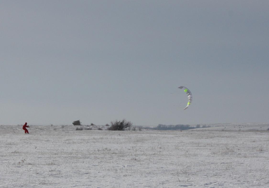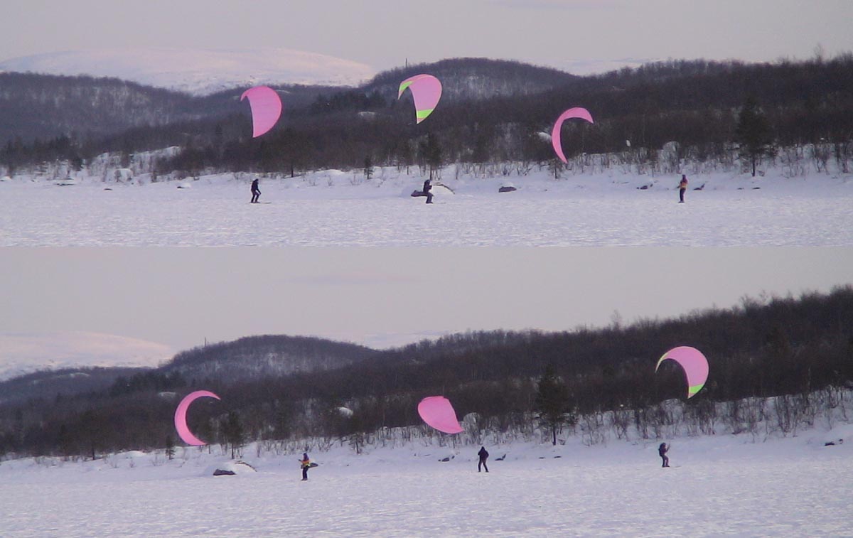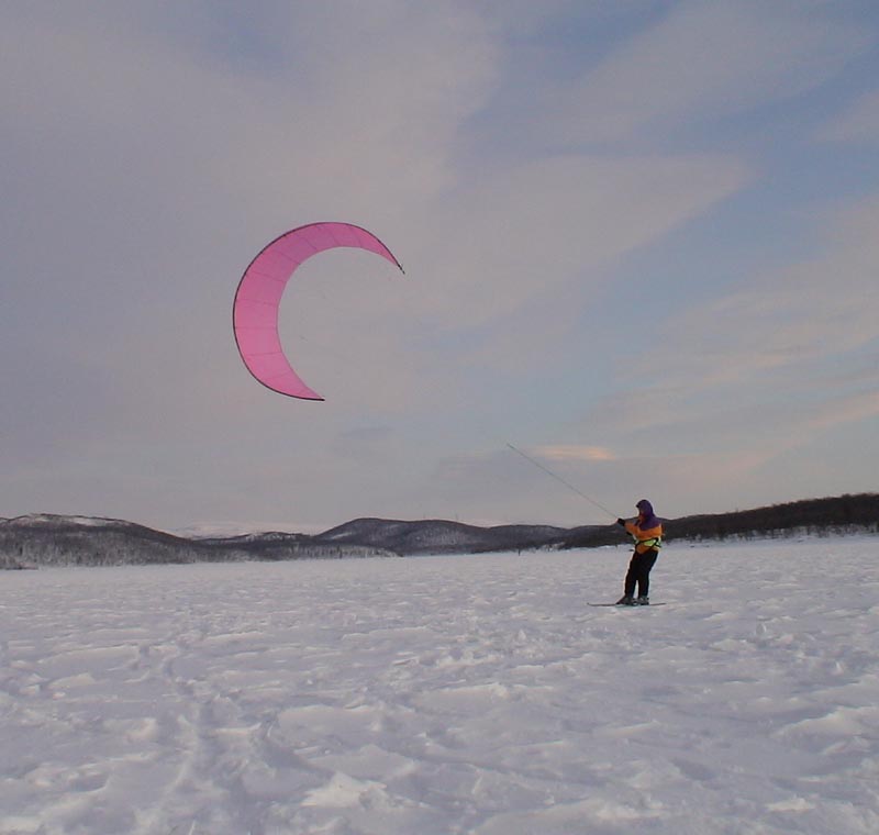 По каталке. Соревнования пришлось отменить из-за слишком разношерстной компании и длинного маршрута, решили переименовать в заезд-каталку. определились с ориентирами и рекомендациями кому куда рекомендуется доезжать и откуда возвращаться, чтбы потом не выискивать на просторах водохранилища. Были сотове телефоны, машина подбора на дороге вдоль воджохранилища и девочка Маша на связи. Двинулись в 11.30. Те, у кого былти кайты 10-15 м/кв пошли довольно уверенно, остальные с переменным учпехом. Ветер, дующий по перек водохранилища на нижнем пределе цеплялся за хвойные леса и временами просто исчезал. Коньковый ход был одним из главных тауктических ходов для разгона кайта и получения хоть какой-то тяги. Мы с Али протяащились так ококло 8км и приняли решение лечь на обратный курс, т.к. вопреки прогнозу ветер стал пропадать на все больший срок, а дальше маршрут шел в лавировку. Позади нас и в стороне то взмывали вверх, то раненой птицей падали на снег фойлы. обратная дорога состояла из двух частей. Вначале та же силовая подготовка лыжника конькового хода, а потом ветерок немного раздулся и подвернул так, что стал дуть вдоль водохранилища, что позволило весьма недурно разгоняться и легко лавироваться против ветра. Интересно было рыбацкие палатки использовать в качестве вешек для слалома. Их там было много сотен, выбирай любую трассу. Остаток дня мы и провели в таких спринтерских 2-3-х километровых каталках заездах. под вечер вернулись те, кто обладал большими площадями и те, чье упорство продвинуло дальше по трассе. Последние вернулись уже хорошо затемно.