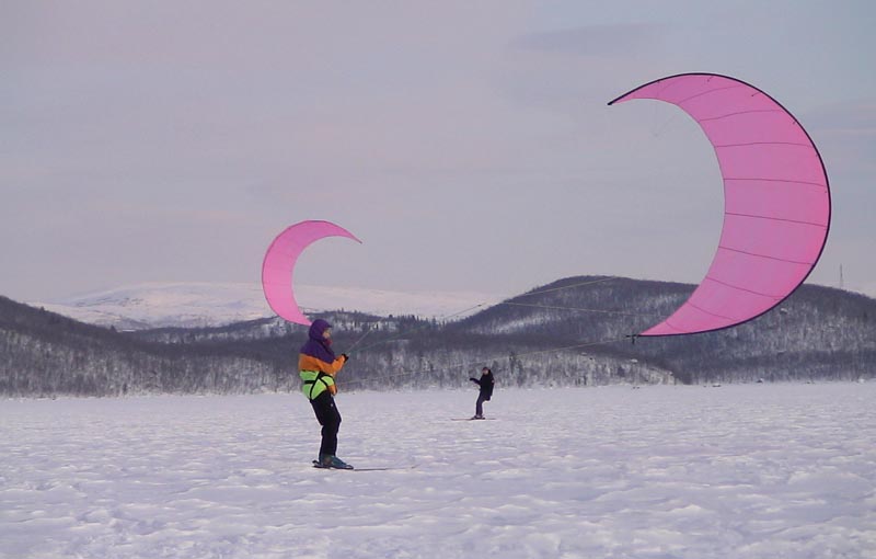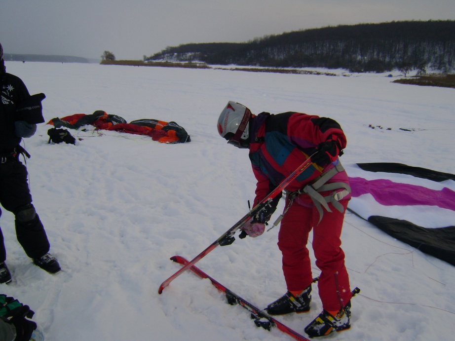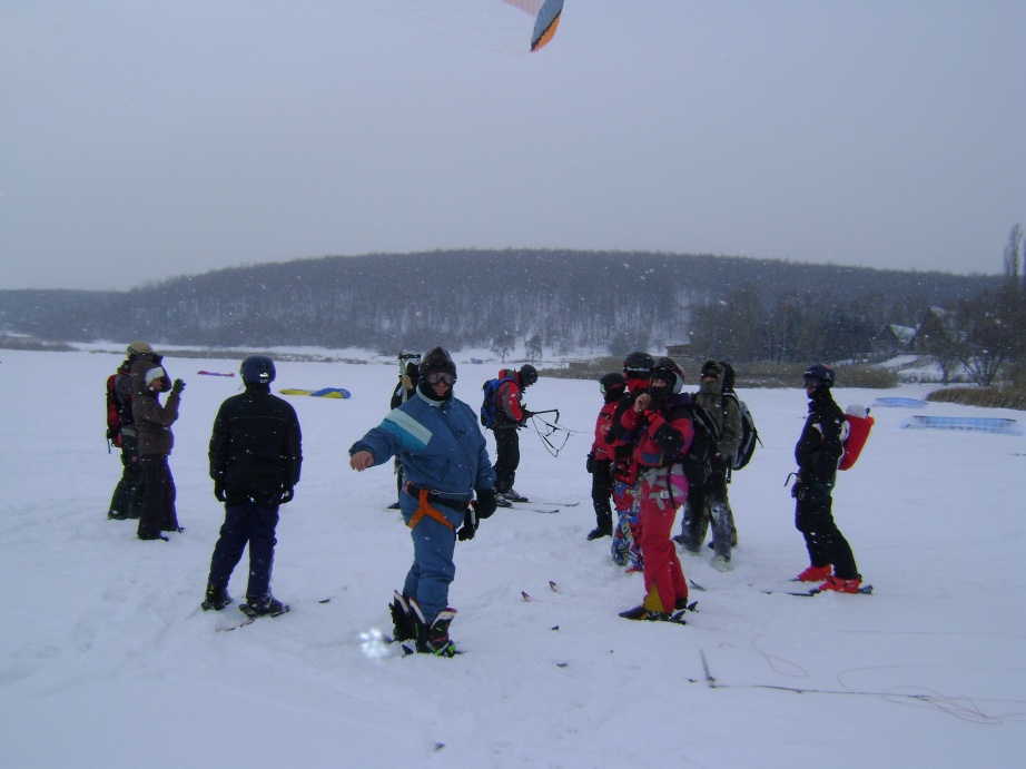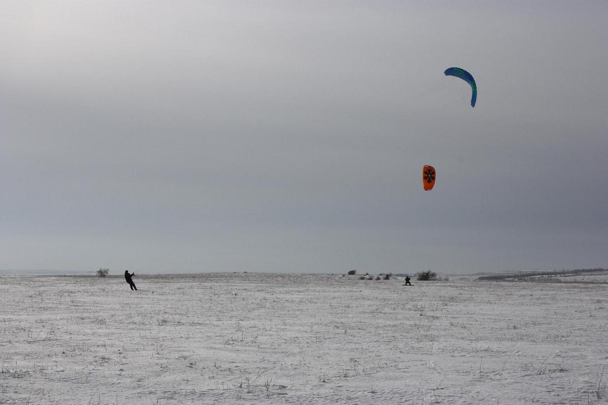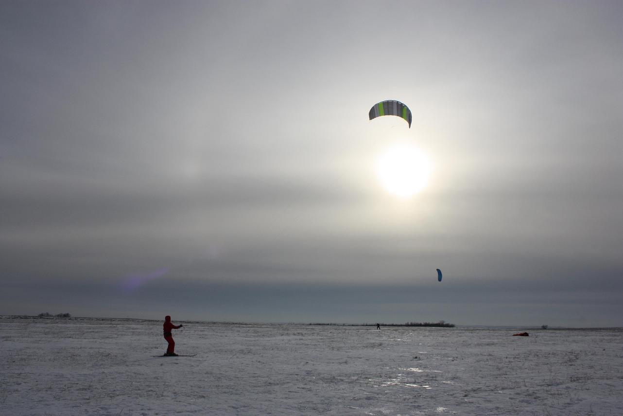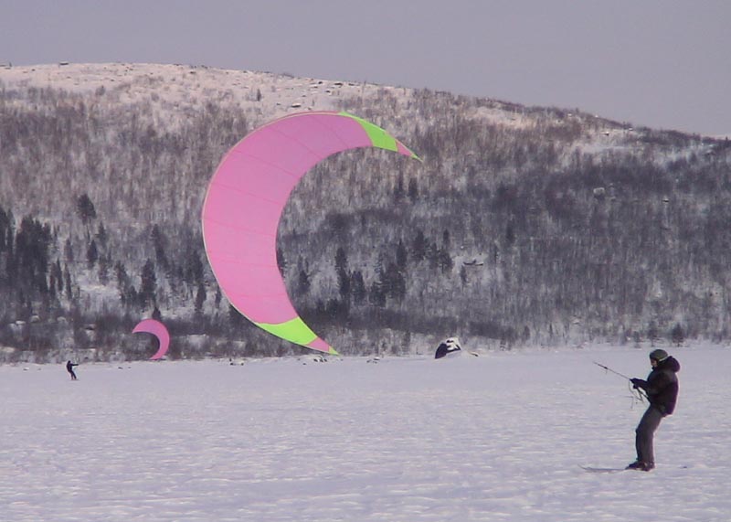 По каталке. Соревнования пришлось отменить из-за слишком разношерстной компании и длинного маршрута, решили переименовать в заезд-каталку. определились с ориентирами и рекомендациями кому куда рекомендуется доезжать и откуда возвращаться, чтбы потом не выискивать на просторах водохранилища. Были сотове телефоны, машина подбора на дороге вдоль воджохранилища и девочка Маша на связи. Двинулись в 11.30. Те, у кого былти кайты 10-15 м/кв пошли довольно уверенно, остальные с переменным учпехом. Ветер, дующий по перек водохранилища на нижнем пределе цеплялся за хвойные леса и временами просто исчезал. Коньковый ход был одним из главных тауктических ходов для разгона кайта и получения хоть какой-то тяги. Мы с Али протяащились так ококло 8км и приняли решение лечь на обратный курс, т.к. вопреки прогнозу ветер стал пропадать на все больший срок, а дальше маршрут шел в лавировку. Позади нас и в стороне то взмывали вверх, то раненой птицей падали на снег фойлы. обратная дорога состояла из двух частей. Вначале та же силовая подготовка лыжника конькового хода, а потом ветерок немного раздулся и подвернул так, что стал дуть вдоль водохранилища, что позволило весьма недурно разгоняться и легко лавироваться против ветра. Интересно было рыбацкие палатки использовать в качестве вешек для слалома. Их там было много сотен, выбирай любую трассу. Остаток дня мы и провели в таких спринтерских 2-3-х километровых каталках заездах. под вечер вернулись те, кто обладал большими площадями и те, чье упорство продвинуло дальше по трассе. Последние вернулись уже хорошо затемно.