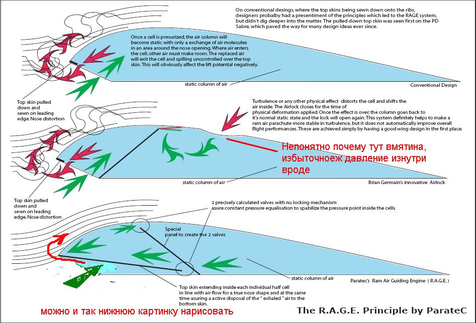 Но что-то мне подсказывает, что в такой схеме воздух тоже может перетекать на верхнюю поверхность, ведь точка разделения потока плавает в зависимости от угла атаки. Просто объем носовой камеры получается меньше (что впрочем тоже хорошо).