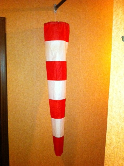 ...это такая слегка конусная полосатая труба(колбасина),в передней широкой части вставлено кольцо для поддержания формы.Закреплено все на оси и мачте.Ветер дует,и по тому как расправлен колдун можно судить о скорости и направлении.
