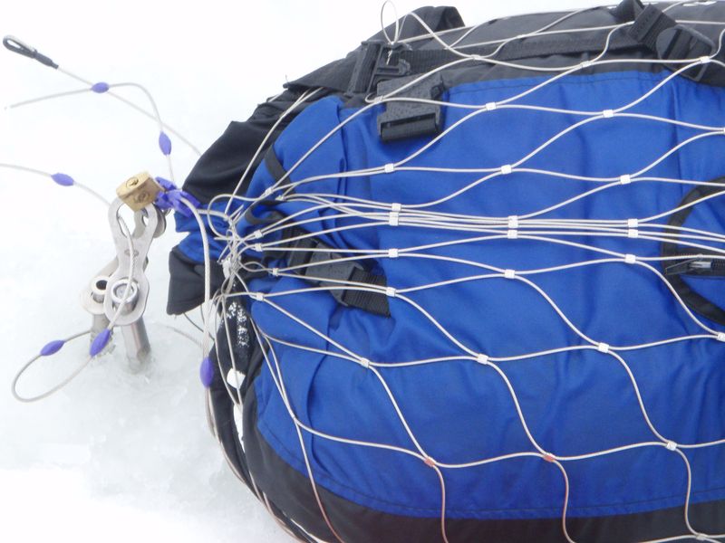 Может поздно, но вот под конец сезона решил показать один способ на будущее, так как часто видел просто брошенные без присмотра вещи на льду. Я использую два "буравчика", можно и один и плюс штырь меньшего диаметра чем ледобур, с ухом . Сетка-мешок из нержавейки, такую можно купить. Она очень компактна в свернутом состоянии. Конечно из льда можно и вырубить крепеж и сетку можно покромсать, но на это требуется время. А схватить и смыться уже не получится.