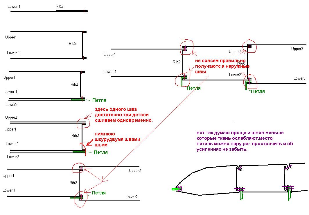 я смотрела гамму. там хорошо описанно как с чего начать, но очеу то нигде подробно не расписанно как и менно шить. я так поняла начинать нужно с центрального балона, причем швами наружу. потом аккуратно пришиваем к нему верхний и нижний профили, далее рибу, опять же швом наружу и так далее. направление шва соответствует направлению крыла. только первоначально проши вам на рибе место, где будет воздухозаборник (кстати, надо ли там усиливать или достатично закрытого шва?). в финле прошиваем заднюю часть и уши. верно я себе все это представляю?