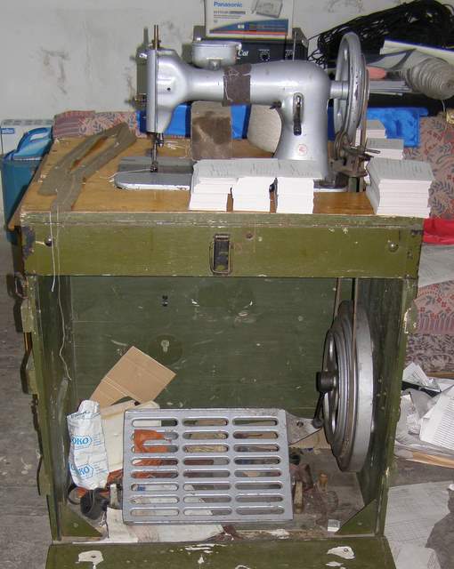 Этот зелёный ящик, на котором она закреплена в начальном виде имеет откидную переднюю стенку и раскладную в обе стороны крышку. Крышка образует рабочий стол, а передняя стенка - пол для работающего. По высоте ящик предназначен для работы стоя, так что стул не требуется. Т.е. швейное производство на таких машинах можно разворачивать прямо в чистом поле, однако для моих машин требуется ещё электичество, а для этой - только атлетичная швея Smile.