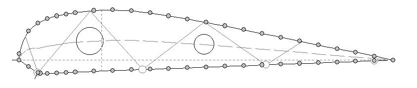 Этот профиль является модифицированным профилем от Jojo RS2700. Мы сделали этот кайт небольшой площади - только 1,3 m^2. Мы также хотели поэкспериментировать с диагональными нервюрами, чтобы уменьшить количество строп. Просто проредить строповку не получится – этого оказывается не достаточно, чтобы поддерживать правильную форму кайта.