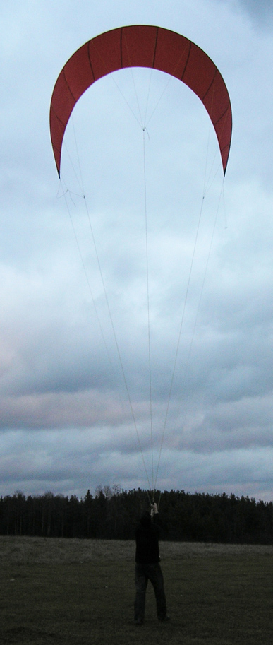 ткань купола- спинакерная. карман- дакрон. стропы - дайнима в оплетке, клеванты из капроновой веревки (нормальных строп не хватило... потом заменю)