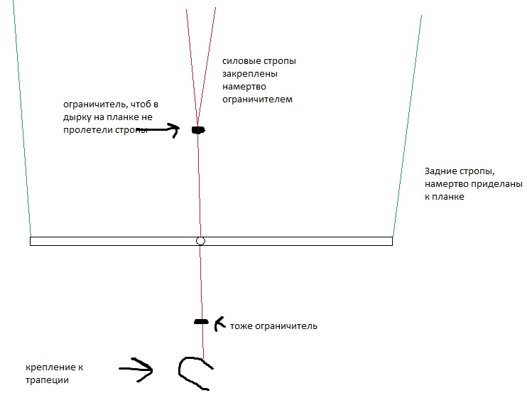можно сделать так, но что значит крепить стропы намертво? не нужно это делать. намертво можно прикрепить поводки с узелками к планке, а к узелкам уже вязать стропы. на центральном шкоте, по каторому ходит планка нужно сделать колечко или тоже узелки, за это и привязать силовые стропы. Нижний ограничитель хода планки, кажется, совсем ни к чему. чикен ,или что там у вас, и будет ограничителем, а вверху ограничитель желателен. И ещё! А какой кайт планируется стать на планку?