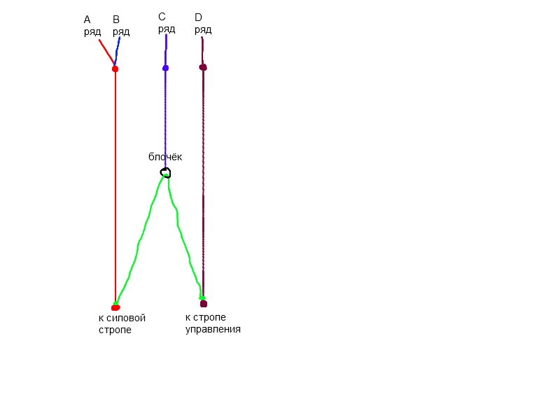 Эти пучки соединяем с изготовленными стропами 2-го уровня. Должно получится 3 больших пучка, А вместе с В, С, D.