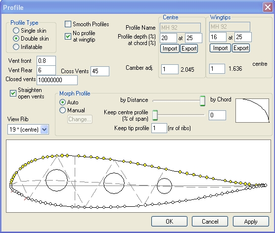 понимаю..... но ведь есть такое понятие как наука, цифры . профиля приведенные в сурф плане расчитывались на уровне летательных апаратов, они продувались и кривизна их тоже расчитывалась соответственно ,не случайно там все в процентах т.е. величина хорды обязательно должна быть пропорциональна толщине и кривизне .... что обеспечивает высокое аэродинамическое качество. а летать то будет ...просто у более толстого профиля (завышеного от руки, на всякий случай)срыв потока на верхней плоскости крыла поизойдет не как положено, а раньше, скажем не 11 градусах а на 7 градусах , и получится что можно просто не дотянуть до посадки или при порыве ветра апарат сдует .... я не настаиваю ,это просто информация . все цифры можно проанализировать в аэро трубе -попробуй ,и сам в этом убедишься, к стати профиль мн93 параплана класса стандарт , такие профиля стоят на парапланах класса стандарт, т.е. его практически не возможно сложить ,он обеспечивает высокую степень безопасности, а вот профиль modmh78 он очень летучий т.е при при одинаковых метео условиях он будет летать лучше т.е. создавать большую подьемную силу , но очень склонен к складываниям и классифицируется как ,сертификации -2 и доступен только опытным пилотам ...
