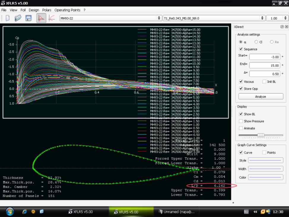 разницу в толщине профиля даст уменьшение хорды т.е. хорда на ушах у тебя будет ,,короче,, соответственно и толщина профиля будет меньше.на этих картинках видно, что один и тот же профиль с разной толщиной в одинаковых условиях ведет себя по разному, причем профиль с меньшей толщиной в любом случае ведет себя лучше, при угле атаки в 1 град. он развивает большую подьемную силу 7.001 а тот же профиль с толщиной 22 % развивает меньшую подъемную силу 6.2 ,. при углах атаки 10.50 град. это значение очень отличается друг от друга , 39 толстый, и 63 тонкий реально почти в половину, т.е. крыло с профилем в 17 % еще будет создавать подьемную силу ,а крыло с профилем 22% даже не сможет развить равной подьемной силы во всем диапазоне от 1 до 10.50 град . толщина 22% ХУЖЕ ВО ВСЕМ ДИАПАЗОНЕ .планеризм как и кайтинг спорт который подразумевает участие ветра , т.е. дует ветер ,запускаешь крыло и при помощи этих потоков ты паришь , парение происходит при ветре 6-7-..(у каждого профиля своя верхняя граница,) метров в секунду это достаточно крепкий ветер, и толстый профиль (от руки) может просто не справится со своей задачей ,это не безопасно.... вообщем нужен более тонкий расчетливый подход , выше приведенный пример это теория в общих чертах , ни к чему не принуждаю ни чего не советую , постарайся понять и расчитать как считаешь нужным .. .