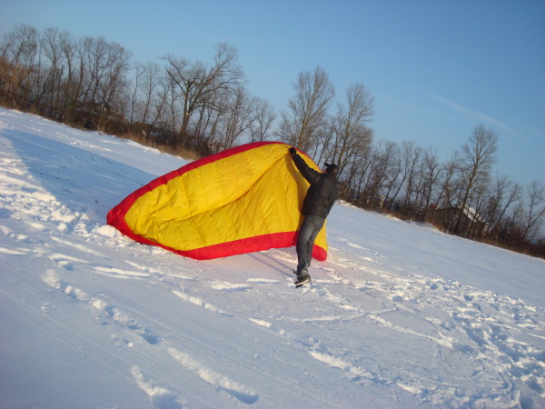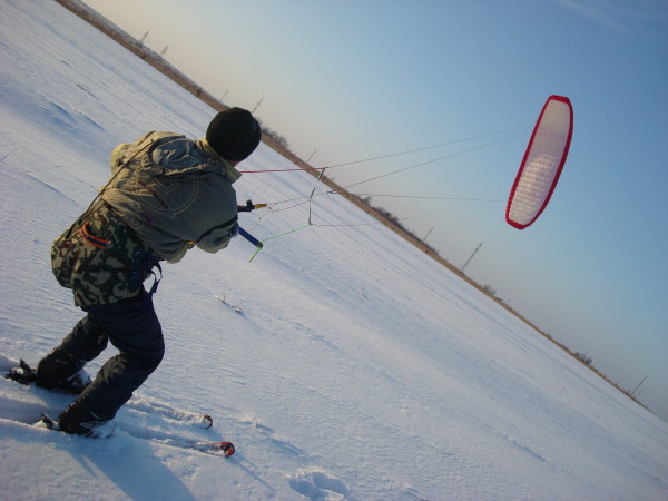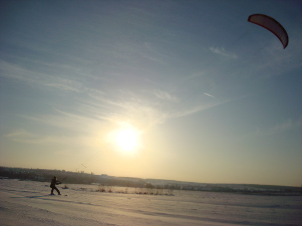 снега у нас нету, зато есть лед вышел сегодня опробовать свой холодок-10, при ветре 13 м/с с порывами до 19 итог : пока пытался разложить стропы купол наполнился и перевернулся лобиком в лед, но это его не успокоило он один фиг стал подниматься и крутиться так как стропы распутать не успел (видимо одна сторона затянута была), и вот вижу я как мимо меня планка проезжает, хватаю ее и вслед за всем этим делом качусь как сумасшедший, стропы запутываются еще больше, работает только половина крыла (вторая сложилась и запуталась в стропах), кайт естественно не управляем, тянет туда куда ветер дует, в середине озера налетел на небольшую трещину во льду падаю на колени (благо наколенники надел) и так еду до конца озера, под конец меня так разогнало, что я чуть не обделался, бросил я планку, кайт улетел в камыши и только там остановился, за ним там же остановился и я на коленках (метров 150 без кайта так ехал). Так получалось еще раза три (при таком ветре стропы просто не успевал разложить). Только один раз кое-что получилось доехал до середины озера и слился (слишком большую скорость набрал, а затормозить ни как не получалось)