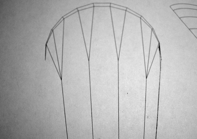 Соединим точки ушей с точкой схождения силовых строп на виде спереди и оценим насколько у нас ухо направлено в сторону от планки. Тут надо принять решение в зависимости от жесткости прута каркаса оставить как есть, подгрузить ухо небольшим углом атаки, или поправить арочность, чтобы последняя панель смотрела четко на точку схождения.