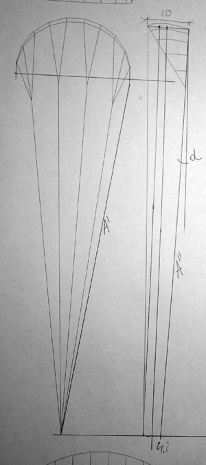 На виде спереди проводим рулевые из концов ушей в точку схождения строп(планка проецируется в точку). На виде сбоку опускаем перпендикуляр с конца хорды. Измеряем угол между перпендикуляром и задней кромкой. Чтобы узнать истинную длину клеванты надо поделить длину её проекции на виде спереди на косинус угла между её проекцией на виде сбоку и вертикалью.